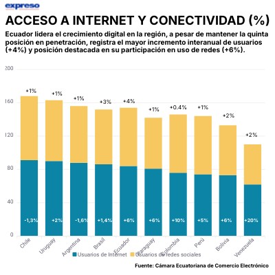 Ecuador lidera el crecimiento digital en la región, a pesar de mantener la quinta posición en penetración, registra el mayor incremento interanual de usuarios (+4%) y posición destacada en su participación en uso de redes (+6%).