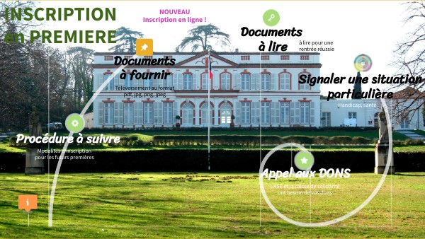 1) Vérifier et mettre à jour si besoin les informations personnelles et celles de votre enfant. (Attention : remplir obligatoirement le mail, et le téléphone de l'élève s'il en dispose) 2) Choisir éventuellement un des enseignements facultatifs 3) Choisir obligatoirement le statut de l'élève (demi-pensionnaire (4 ou 5j) ou externe ou interne hébergé statut réservé aux SHN et section rugby). 4) Consulter les documents d'information 5) Transmettre en ligne les documents à fournir Tout élève non inscrit le mardi 1er juillet au soir perdra automatiquement sa place et un élève en attente sera affecté.Pour toute famille qui aurait des soucis pour s'inscrire en ligne, un accueil est prévu au sein du lycée, le mardi 1er juillet de 8h30 à 16h30.
