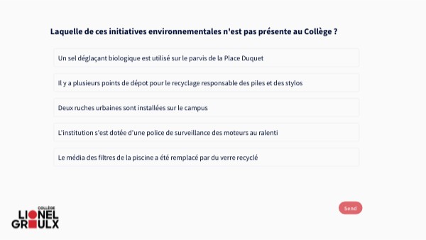 Le Collège a l'environnement à coeur et c'est pourquoi de nombreuses initiatives sont mises sur pied pour le protéger. Du petit geste au plus complexe, le comité institutionnel de l'environnement a pour objectif de mobiliser la communauté collégiale afin d'agir selon quatre grands axes. Les initiatives nommées dans la précédente page sont toutes issues d'idées des membres du personnel. Bien que la police du moteur au ralenti n'existe pas officiellement, plusieurs personnes sensibilisent les utilisateurs lorsqu'ils en sont témoins. Le Collège est aussi actif au chapitre du transport durable, en collaboration avec la firme MOBA. Un plan de gestion des déplacements a été déposé et le plan d'action pour favoriser le transport durable prend place, un pas à la fois.