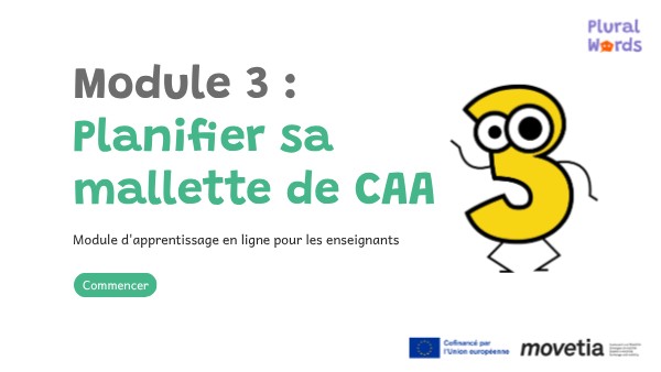 Dans ce module, vous explorerez les étapes nécessaires pour planifier vos mallettes de CAA. En partant de l'identification des besoins de vos élèves, vous découvrirez plusieurs aspects à prendre en compte lors de l’élaboration de la structure d'une boîte de CAA, ainsi que les ressources et les outils qui peuvent vous être utiles.