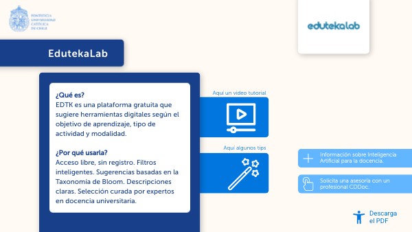 ¿Qué es? EDTK es una plataforma gratuita que sugiere herramientas digitales según el objetivo de aprendizaje, tipo de actividad y modalidad. ¿Por qué usarla? Acceso libre, sin registro. Filtros inteligentes. Sugerencias basadas en la Taxonomía de Bloom. Descripciones claras. Selección curada por expertos en docencia universitaria.