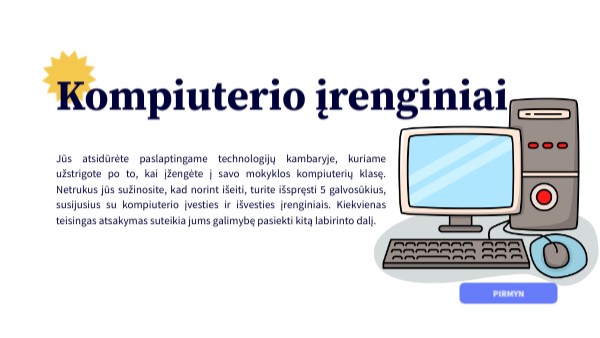 Jūs atsidūrėte paslaptingame technologijų kambaryje, kuriame užstrigote po to, kai įžengėte į savo mokyklos kompiuterių klasę. Netrukus jūs sužinosite, kad norint išeiti, turite išspręsti 5 galvosūkius, susijusius su kompiuterio įvesties ir išvesties įrenginiais. Kiekvienas teisingas atsakymas suteikia jums galimybę pasiekti kitą labirinto dalį.
