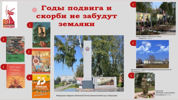 "Аллея Героев Советского Союза" в р.п. Мошково За годы войны из Мошковского района ушли на фронт 7480 человек, вернулись - 2960. Великая Отечественная война дала стране много Героев Советского Союза, среди них 12 наших земляков.Герои Советского Союза Мошковского района Анисичкин Фёдор Иванович Барков Михаил Иванович Волков Андрей Алексеевич Данилов Леонид Парфёнович Жуков Георгий Иванович Иванов Василий Харлампьевич Кобелев Аркадий Васильевич Мурашкин Михаил Фёдорович Осипов Семён Дмитриевич Федюков Алексей Герасимович Цибизов Иван Андреевич
