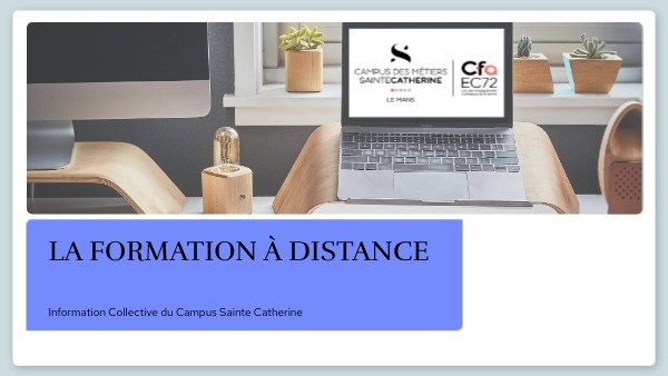 La formation à distance proposée par le Campus Sainte Catherine est une manière de se former, d'acquérir des compétences sans venir assister à des cours physiquement. L'acquisition de ces compétences se fait via un ordinateur, une tablette ou un smartphone avec internet en se connectant à une plateforme de formation. Elle demande à l'apprenant de se libérer du temps pour suivre les cours, faire les recherches et les exercices associés. De profil autonome, l'apprenant n'est pourtant jamais seul.