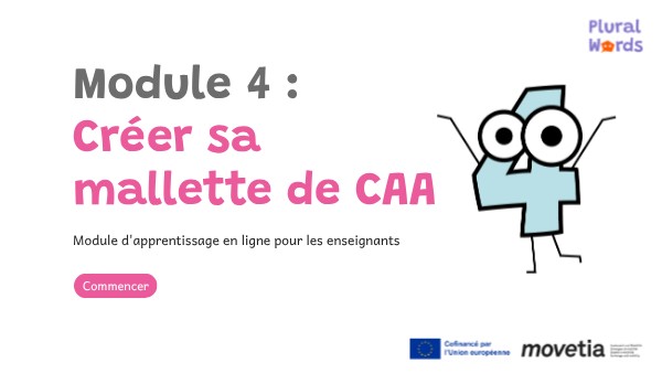 La CAA peut être une approche efficace et ludique à utiliser en classe pour améliorer la communication, l'inclusion et la participation de tous les élèves et pas seulement de ceux qui ont des difficultés de communication. Maintenant que nous avons exploré ensemble comment élaborer une mallette de CAA, y compris le matériel et les outils nécessaires à cet effet, il est temps de passer de la théorie à la pratique. Le module 4 fournira des instructions faciles à suivre sur la conception d'outils de CAA qui peuvent être mis en œuvre.