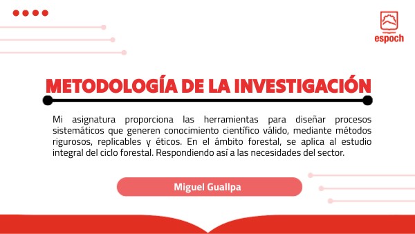 Mi asignatura proporciona las herramientas para diseñar procesos sistemáticos que generen conocimiento científico válido, mediante métodos rigurosos, replicables y éticos. En el ámbito forestal, se aplica al estudio integral del ciclo forestal. Respondiendo así a las necesidades del sector.