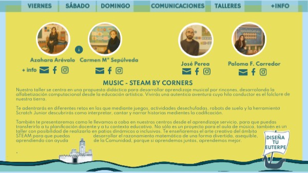 Nuestro taller se centra en una propuesta didáctica para desarrollar aprendizaje musical por rincones, desarrolando la alfabetización computacional desde la educación artística. Vivirás una autentica aventura cuyo hilo conductor es el folclore de nuestra tierra. Te adentrarás en diferentes retos en los que mediante juegos, actividades desechufadas, robots de suelo y la herramienta Scratch Junior descubrirás como interpretar, cantar y narrar historias medientes la codificación. También te presentaremos como le llevamos a cabo en nuestros centros desde el aprendizaje servicio, para que puedas transferirlo a tu planificación docente y a tu contexto educativo. No sólo es un proyecto para el aula de música, también es un taller con posibilidad de realizarlo en patios dinámicos o inclusivos. Te enseñaremos el arte creativo del ámbito STEAM para que puedas desarrollar el razonamiento matemático de una forma divertida, asequible, aprendiendo con ayuda de la Comunidad, porque si aprendemos juntos, aprendemos mejor. "