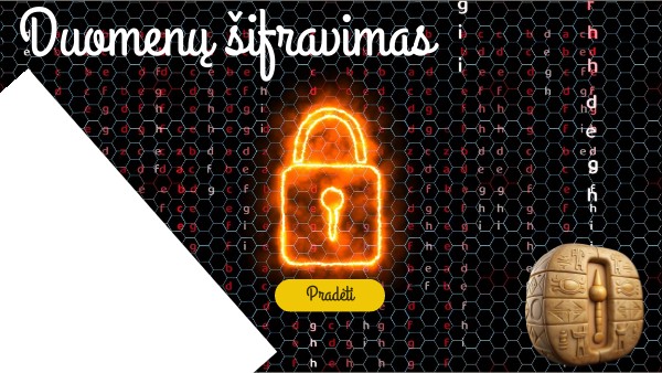 Sveiki, mokiniai! Jūs patekote į paslaptingą pabėgimo kambarį, kuriame laikomi slapti duomenys. Jūsų užduotis – iššifruoti užkoduotas žinutes, kad galėtumėte pabėgti ir atskleisti paslaptis, kurios slepiasi šioje erdvėje. Jūsų kelionė prasideda dabar! Norėdami išspręsti užkoduotas žinutes, turite perskaityti Informatikos vadovėlio 5-6 klasei, skyrelį „Kaip šifruojame duomenis?“ (2 dalis 26-31 psl). Kiekvienas teisingas atsakymas artins jus prie galutinio išėjimo kodo.