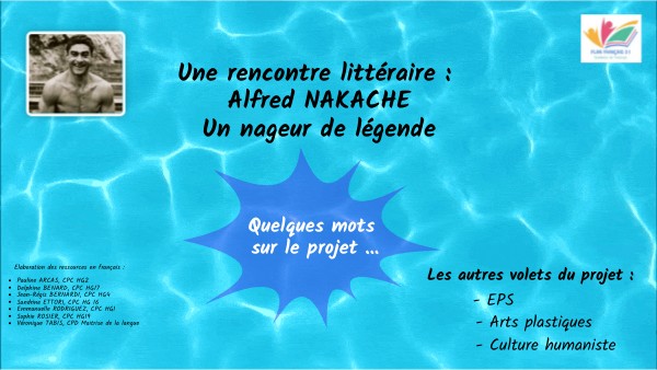 Cette proposition en littérature s'inscrit dans la continuité du projet départemental natation "Journée Nakache" concernant le nageur Alfred NAKACHE. Elle est l'occasion pour les équipes enseignantes de cycle 3 d'aborder la lecture orale, la compréhension de textes et la production d'écrits.