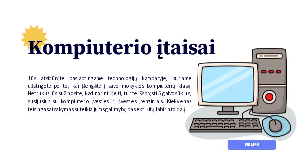 Jūs atsidūrėte paslaptingame technologijų kambaryje, kuriame užstrigote po to, kai įžengėte į savo mokyklos kompiuterių klasę. Netrukus jūs sužinosite, kad norint išeiti, turite išspręsti 5 galvosūkius, susijusius su kompiuterio įvesties ir išvesties įrenginiais. Kiekvienas teisingas atsakymas suteikia jums galimybę pasiekti kitą labirinto dalį.