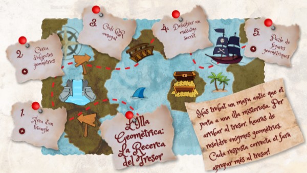 Has trobat un mapa antic que et porta a una illa misteriosa. Per arribar al tresor, hauràs de resoldre enigmes geomètrics. Cada resposta correcta et farà apropar més al tresor!