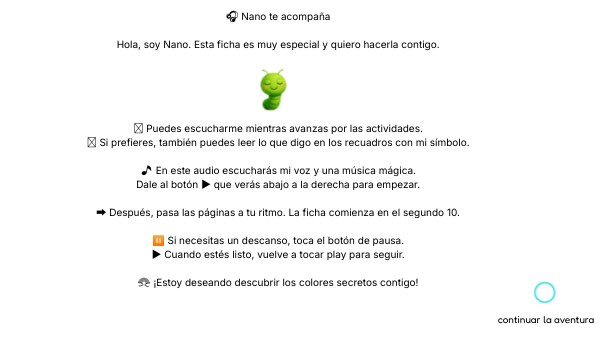 🎧 Nano te acompaña Hola, soy Nano. Esta ficha es muy especial y quiero hacerla contigo. 🟢 Puedes escucharme mientras avanzas por las actividades. 🟣 Si prefieres, también puedes leer lo que digo en los recuadros con mi símbolo. 🎵 En este audio escucharás mi voz y una música mágica. Dale al botón ▶️ que verás abajo a la derecha para empezar. ➡️ Después, pasa las páginas a tu ritmo. La ficha comienza en el segundo 10. ⏸️ Si necesitas un descanso, toca el botón de pausa. ▶️ Cuando estés listo, vuelve a tocar play para seguir. 🌈 ¡Estoy deseando descubrir los colores secretos contigo!
