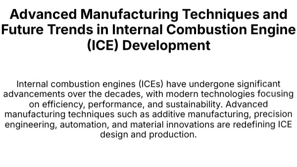 Internal combustion engines (ICEs) have undergone significant advancements over the decades, with modern technologies focusing on efficiency, performance, and sustainability. Advanced manufacturing techniques such as additive manufacturing, precision engineering, automation, and material innovations are redefining ICE design and production.