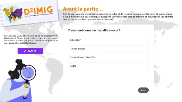 Vous rejouez au jeu et avez déjà complété précédemment l'évaluation ? Cliquez sur le bouton ci-dessous pour passer l'évaluation. Veuillez appuyer sur le bouton uniquement si vous avez déjà complété l'évaluation.