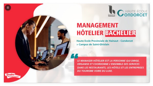 En vue d'occuper un poste managérial, les étudiant.e.s sont initié.e.s aux différents métiers & secteurs auxquels il·elle·s seront confronté.e.s dans leur fonction de gestion d'un établissement hôtelier ou de restauration.