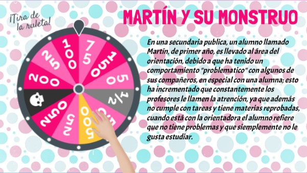 En una secundaria publica, un alumno llamado Martín, de primer año, es llevado al área del orientación, debido a que ha tenido un comportamiento "problematico" con algunos de sus compañeros, en especial con una alumna; esto ha incrementado que constantemente los profesores le llamen la atención, ya que además no cumple con tareas y tiene materias reprobadas, cuando está con la orientadora el alumno refiere que no tiene problemas y que siemplemente no le gusta estudiar.