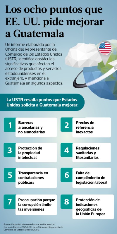 Un informe elaborado por la Oficina del Representante de Comercio de los Estados Unidos (USTR) identifica obstáculos significativos que afectan el acceso de productos y servicios estadounidenses en el extranjero, y menciona a Guatemala en algunos aspectos.