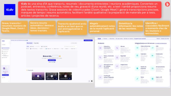 tl;dv és una eina d'IA que transcriu, resumeix i documenta entrevistes i reunions acadèmiques. Converteix un podcast, entrevista, conferència, notes de veu, gravació d'una reunió, etc. a text i també proporciona resums dels textos transcrits. Grava sessions de videotrucades (Zoom, Google Meet) i genera transcripcions precises, marques de temps i resums automàtics, facilitant l’anàlisi qualitativa i la preparació de materials per a tesis, articles i projectes de recerca.