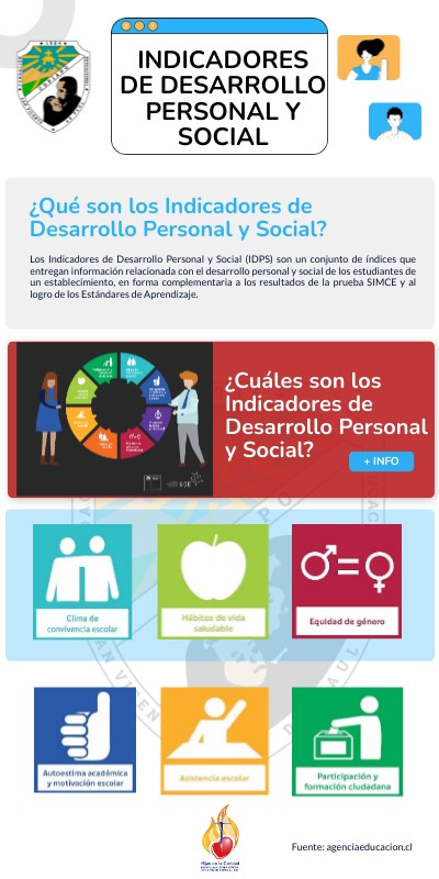 Los Indicadores de Desarrollo Personal y Social (IDPS) son un conjunto de índices que entregan información relacionada con el desarrollo personal y social de los estudiantes de un establecimiento, en forma complementaria a los resultados de la prueba SIMCE y al logro de los Estándares de Aprendizaje.