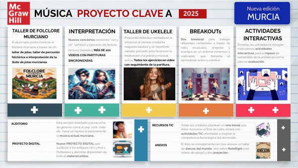 Varios anexos complementan el libro: un taller de edición de partituras online con Noteflight (con videotutoriales de apoyo), un taller de danzas del mundo, dos proyectos (Música en femenino y ExpoSound QR), un taller de iniciación al ukelele y, finalmente, dos breakouts.