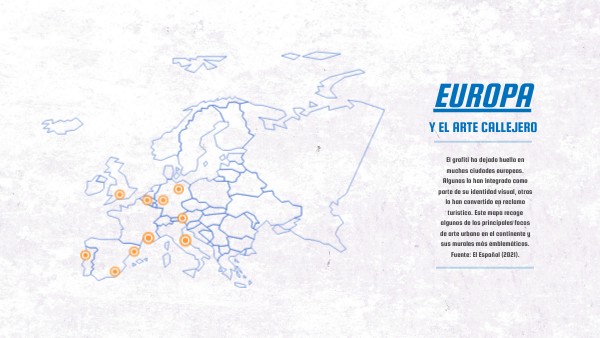 El grafiti ha dejado huella en muchas ciudades europeas. Algunas lo han integrado como parte de su identidad visual, otras lo han convertido en reclamo turístico. Este mapa recoge algunos de los principales focos de arte urbano en el continente europeo, así como las zonas más expuestas a ser utilizadas para esta expresión de arte callejero. Fuente: Visual analytics of graffiti spatial