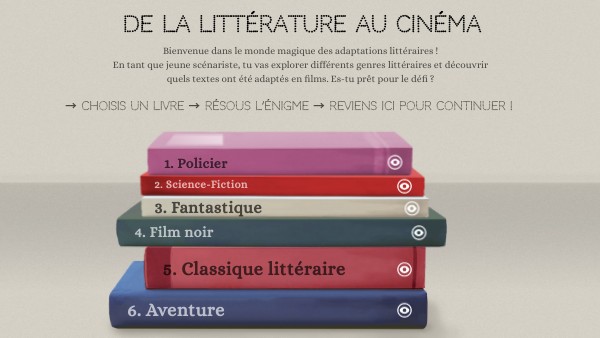 Bienvenue dans le monde magique des adaptations littéraires ! En tant que jeune scénariste, tu vas explorer différents genres littéraires et découvrir quels textes ont été adaptés en films. Es-tu prêt pour le défi ?