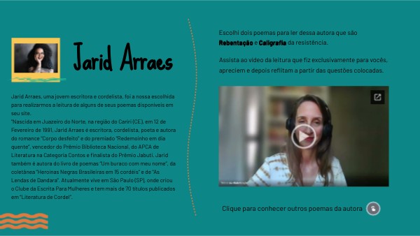 “Nascida em Juazeiro do Norte, na região do Cariri (CE), em 12 de Fevereiro de 1991, Jarid Arraes é escritora, cordelista, poeta e autora do romance "Corpo desfeito" e do premiado “Redemoinho em dia quente“, vencedor do Prêmio Biblioteca Nacional, do APCA de Literatura na Categoria Contos e finalista do Prêmio Jabuti. Jarid também é autora do livro de poemas “Um buraco com meu nome“, da coletânea “Heroínas Negras Brasileiras em 15 cordéis“ e de "As Lendas de Dandara". Atualmente vive em São Paulo (SP), onde criou o Clube da Escrita Para Mulheres e tem mais de 70 títulos publicados em “Literatura de Cordel”.