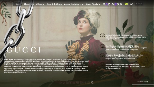 MAZ NEXA submitted a proposal and won a bid to work with the luxury brand Gucci on redeveloping approximately 100 modules from English to Arabic. This project demonstrated MAZ NEXA's ability to manage internal teams and build excellent relationships with clients and external stakeholders. Account managers collaborated closely with Gucci managers and the external translation company to redevelop the modules successfully. Due to the large volume of modules, a robust live tracker was developed to monitor progress and organize the workflow efficiently. The project was managed entirely remotely, resulting in a highly successful outcome and strong relationships.