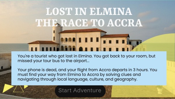 You're a tourist who got lost in Elmina. You got back to your room, but missed your tour bus to the airport... Your phone is dead, and your flight from Accra departs in 3 hours. You must find your way from Elmina to Accra by solving clues and navigating through local language, culture, and geography.