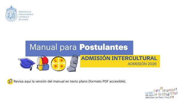En este manual podrás encontrar todos los pasos para realizar una correcta postulación a la vía Intercultural para la Admisión 2026. A través de este documento, podrás resolver tus dudas sobre la inscripción de la postulación online, los documentos que debes subir a la Plataforma de Postulación, y resolver dudas respecto a la Acreditación Socioeconómica para estudiantes migrantes.