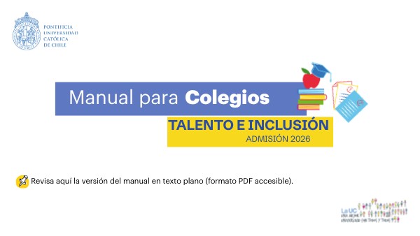 Período de postulación Admisión Talento e Inclusión 2026: Desde el 2 de julio hasta el 15 de octubre de 2025. Para postular, los y las postulantes deberán seguir las instrucciones detalladas del Manual para Postulantes.