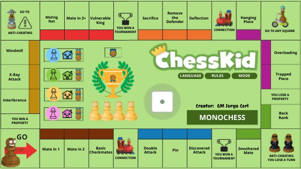 GO: Every time you turn around and pass through this square, you get a medal.TRAIN: Automatically travel to the other train square. YOU WON/LOST A TOURNAMENT: You get a medal automatically without doing any chess puzzle. ANTI-CHEATING: If you are just passing through, no action is taken, but if you got here because of the "Go to Anti-Cheating" square, then you lose a turn. GO TO ANY SQUARE: The player can choose to advance to any square, including special squares. (No medal is awarded if the player pass through GO)