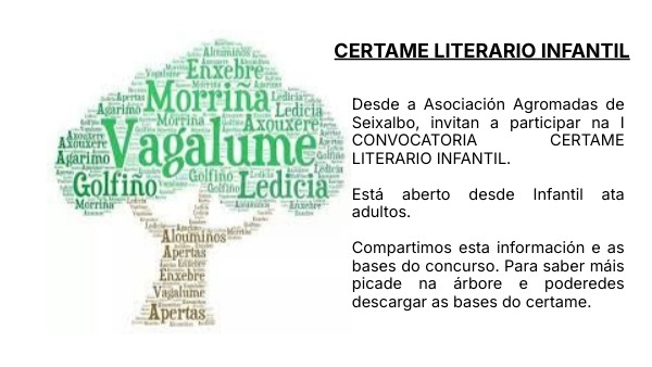 Desde a Asociación Agromadas de Seixalbo, invitan a participar na I CONVOCATORIA CERTAME LITERARIO INFANTIL. Está aberto desde Infantil ata adultos. Compartimos esta información e as bases do concurso. Para saber máis picade na árbore e poderedes descargar as bases do certame.