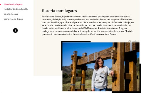 Purificación García, hija de viticultores, realiza una ruta por lagares de distintas épocas (romanos, del siglo XVII, contemporáneos), una actividad dentro del programa Naturaleza para los Sentidos, que ofrece el parador. Se aprende sobre vino y se disfruta del paisaje, un valle donde predomina la pizarra, la arcilla, el cuarzo; donde la uva está mineralizada, de donde salen los blancos y los tintos de la DO Monterrei. La visita termina en Triay, su bodega, con una cata de sus elaboraciones y de su tortilla y un chorizo de la zona. “Todo lo que cuento me sale de dentro, he nacido entre viñas”, se emociona García.
