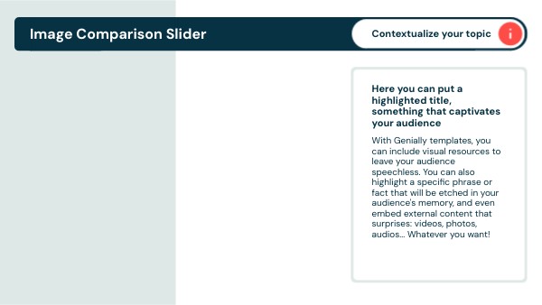 With Genially templates, you can include visual resources to leave your audience speechless. You can also highlight a specific phrase or fact that will be etched in your audience's memory, and even embed external content that surprises: videos, photos, audios... Whatever you want!