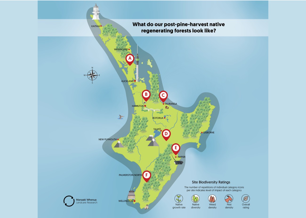 This site, near Shannon in the Manawatū-Whanganui region, was pine harvested in 2013 and was 11 years old in this photo. The natural regeneration includes some eucalypts as a nursery crop to protect the young native trees as they grow. This is a wonderfully diverse regenerating forest, which houses a range of native shrubs and trees including horopito, putaputawētā (marbleleaf), and coprosmas, as well as podocarp species such as miro, tōtara, rimu, and threatened rātā. There are a few invasive wilding pines, and the deer population is controlled by hunters. This native regenerating forest is a wonderful example of a high-elevation temperate rainforest, but the high elevation does mean that tree growth is slower here.