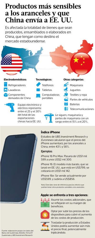 Estudios de UBS Investment Research y Euronews calcularon que el precio del iPhone aumentará, por los aranceles a China, entre 43% y 56%. Ejemplos: iPhone 16 Pro Max: Pasaría de US$1 mil 599 a unos US$2 mil 300. iPhone 16: El modelo más barato, que se lanzó en EE. UU., que está en US$799, se cotizaría en US$1 mil 142. iPhone 16e: Se vende actualmente por US$599, y subiría a US$856.
