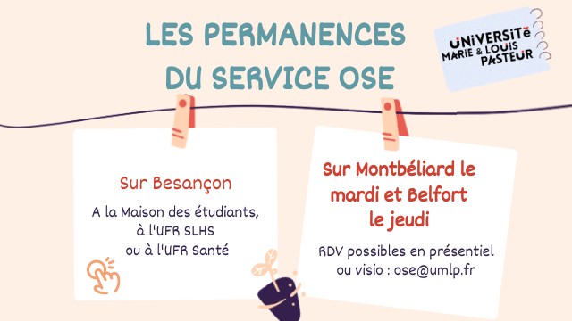 Le service OSE vous accueil sur rendez-vous à la maison des étudiants à Besançon. Si vous souhaitez prendre RDV, contacter le service par mail (ose@umlp.fr) en indiquant vos coordonnées, votre formation actuelle et la raison de votre rendez-vous.