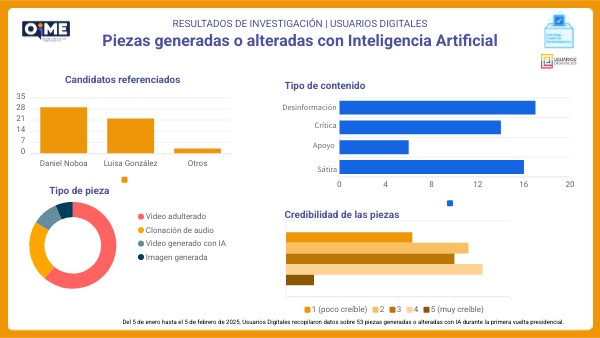 Del 5 de enero hasta el 5 de febrero de 2025, Usuarios Digitales recopilaron datos sobre 53 piezas generadas o alteradas con IA durante la primera vuelta presidencial.
