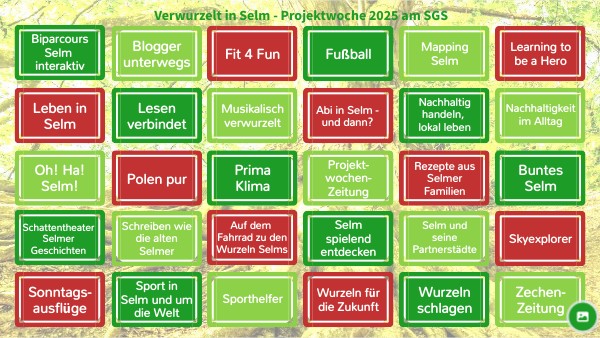18 - Buntes SGS – Woher wir kommen. Wer wir sind. Wohin wir wachsen Die Projektwoche soll die Vielfalt unserer Schulgemeinschaft sichtbar machen und ein Bewusstsein für die unterschiedlichen kulturellen, familiären und persönlichen Wurzeln unserer Schüler:innen schaffen. Gleichzeitig möchten wir gemeinsam erkunden, wie wir in Selm neue „Wurzeln schlagen“ und unsere Schule aktiv und bunt mitgestalten können. Ziel ist die Förderung von Toleranz, Identität, Gemeinschaft und Teilhabe.Wo liegen meine Wurzeln – kulturell, familiär, emotional?Wie prägt meine Herkunft mein heutiges Ich?Was bedeutet Heimat für mich?Wie kann ich in Selm Wurzeln schlagen und mich in der Gemeinschaft verwurzeln? Jahrgangsstufen: 5 bis EF Voraussichtliche Kosten: Keine Projektleitung: Leonie Komossa, Franziska Schürmann