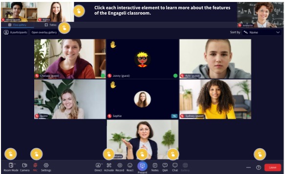Click each interactive element to learn more about the features of the Engageli classroom.