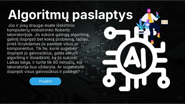 Jūs ir jūsų draugai esate išskirtinio kompiuterių mokslininko Roberto laboratorijoje. Jis sukūrė galingą algoritmą, galintį išspręsti bet kokią problemą, tačiau prieš išvykdamas jis paslėpė visus jo komponentus. Tik tie, kurie sugebės išspręsti jo galvosūkius, galės atkurti algoritmą ir išsiaiškinti, ką jis sukūrė! Laikas bėga, ir turite tik 60 minučių, kol laboratorija bus uždaryta. Ar sugebėsite išspręsti visus galvosūkius ir pabėgti?