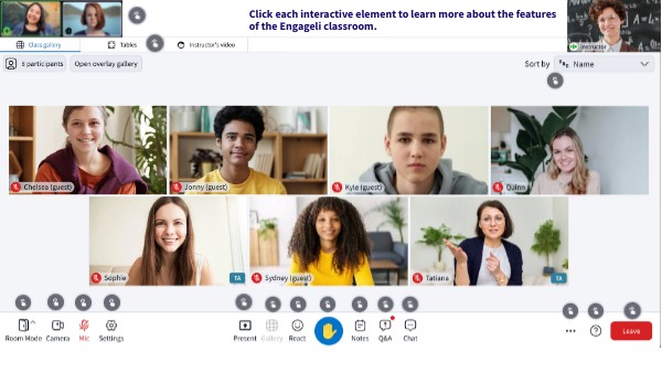 Click each interactive element to learn more about the features of the Engageli classroom.