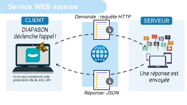 Ici, on a besoin de connaître le code postal d'une ville qu'on a entrée dans DIAPASON: la ville de JUILLAN. On va donc envoyer une demande à une application qui permet de renvoyer le code postal d'une ville !