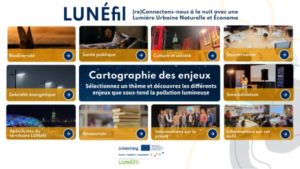 Les informations reprises dans cet outil proviennent de moments d'échange participatifs menés avec les diverses parties prenantes du projet LUNÉfil. Elles ciblent les enjeux globaux liés à la pollution lumineuse. Les éléments d'analyse ayant une portée plus locale seront valorisés à travers un outil dynamique associé à un observatoire participatif qui sera également créé dans le cadre du projet LUNÉfil. La cartographie est vouée à évoluer au fur et à mesure du projet et des différents ateliers qui seront menés.