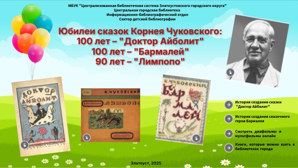 Юбилеи сказок Корнея Чуковского: 100 лет – "Доктор Айболит" 100 лет – "Бармалей" 90 лет – "Лимпопо"