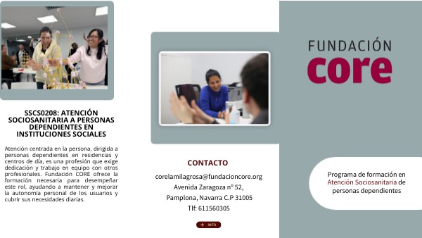 Atención centrada en la persona, dirigida a personas dependientes en residencias y centros de día, es una profesión que exige dedicación y trabajo en equipo con otros profesionales. Fundación CORE ofrece la formación necesaria para desempeñar este rol, ayudando a mantener y mejorar la autonomía personal de los usuarios y cubrir sus necesidades diarias.