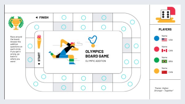 Race around the board. Answer the addition questions on each circle. If you get it wrong, go back to where you were!