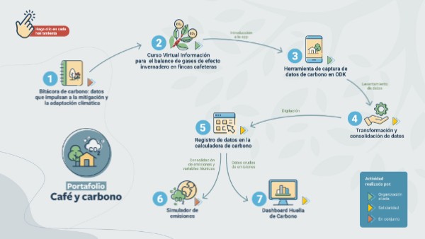 Es una herramienta interactiva de visualización de datos que permite analizar, monitorear y comunicar los resultados obtenidos de los cálculos de emisiones y almacenamiento de carbono en sistemas cafeteros. Mediante gráficos dinámicos y filtros personalizados, el tablero facilita la interpretación de los datos ingresados en la calculadora de carbono. Esta visualización permite identificar tendencias, comparar prácticas y apoyar la toma de decisiones informadas orientadas a la mitigación y adaptación al cambio climático.