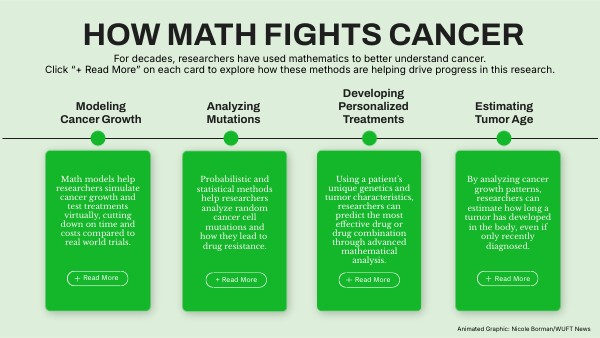 For decades, researchers have used mathematics to better understand cancer. Click “+ Read More” on each card to explore how these methods are helping drive progress in this research.